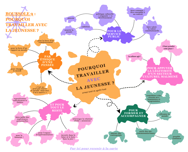 De ce travail est né un document composé d’une carte et de dix « boussoles ». Pensé comme un outil de navigation, il propose des repères pour accompagner les pratiques d’intervention et ouvrir des pistes d’action dans le champ du spectacle vivant. Il ne s’agit pas d’un modèle à suivre, mais d’un support pour expérimenter, ajuster, et construire des relations plus attentives, durables et transformatrices avec les jeunes.